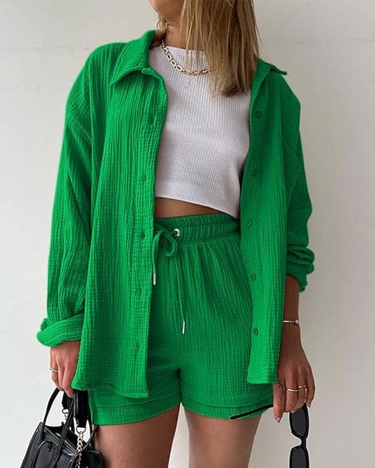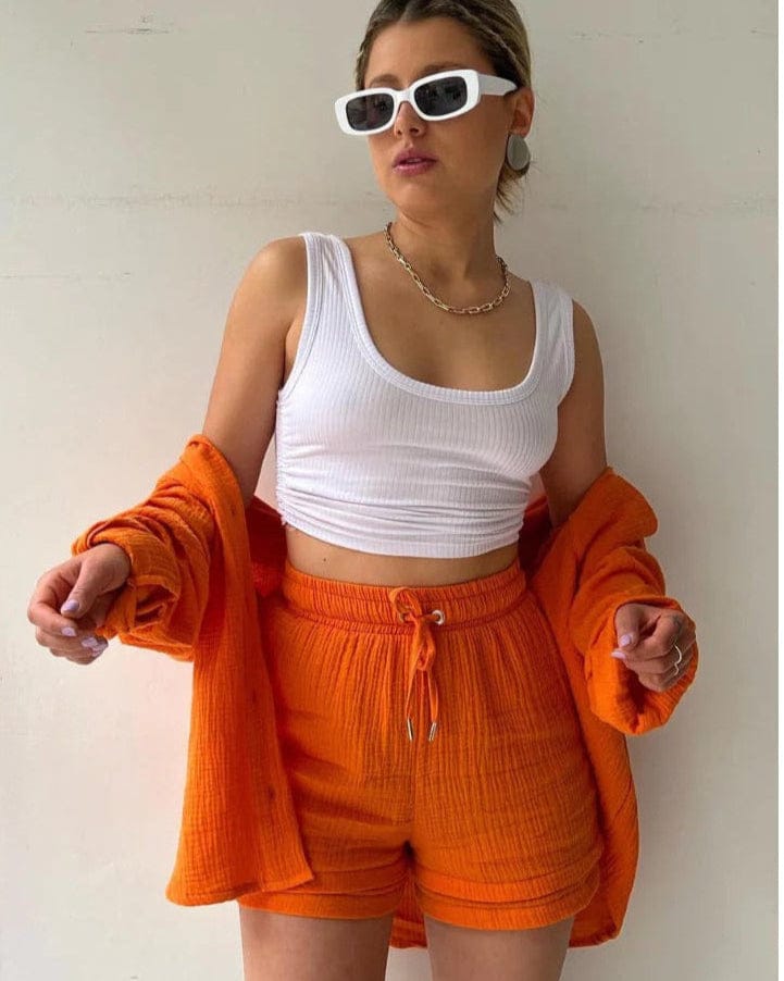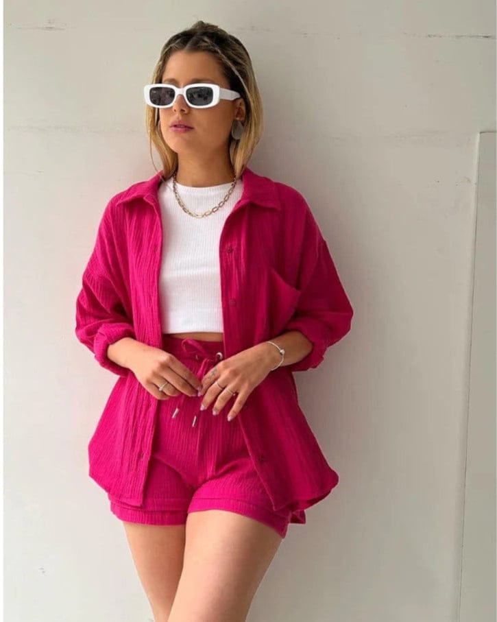 La chemise à col classique et manches longues épouse délicatement vos formes, tandis que le short taille haute vous offre une liberté de mouvement incomparable.